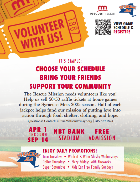 Visit the Rescue Mission Volunteer Hub to Register: Syracuse Mets 50.50 Volunteer Registration